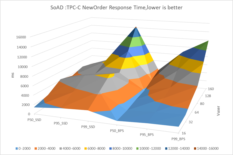 使用PMem和SSD分别作为Oralce 19c Redo Log,顺利获得HammerDB测试不同并发数统计NewOrder的50%、95%、99%事务的平均响应时间,BPS响应时间要显著优于SSD。