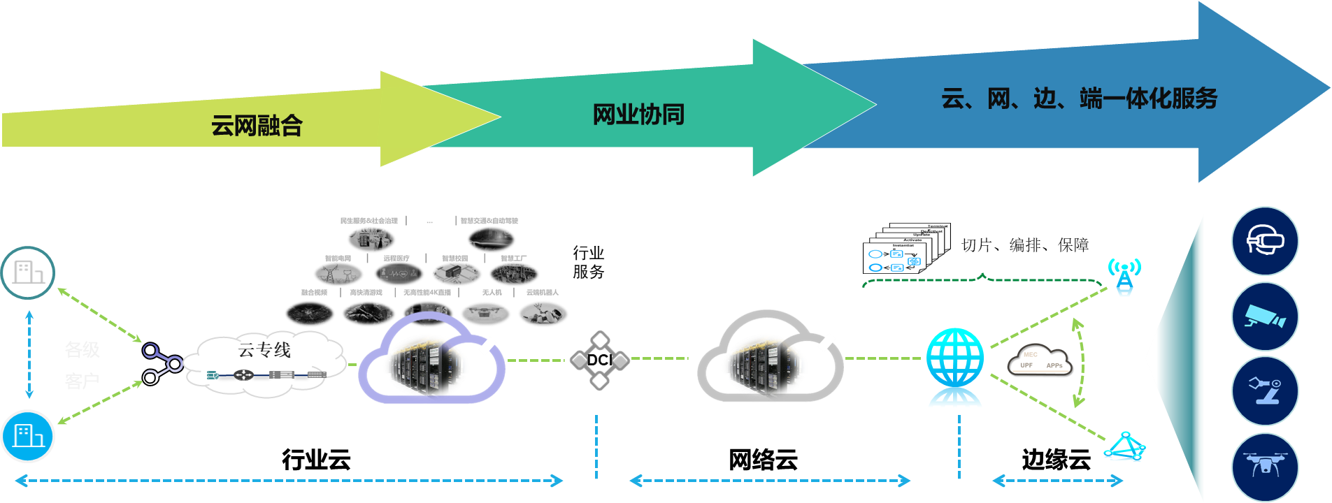 构建面向前端客户的一体化“云网融合运营平台“,实现对承载网络的灵活管控,客户业务的灵活订制,快速开通、自助运营和服务的可视化。