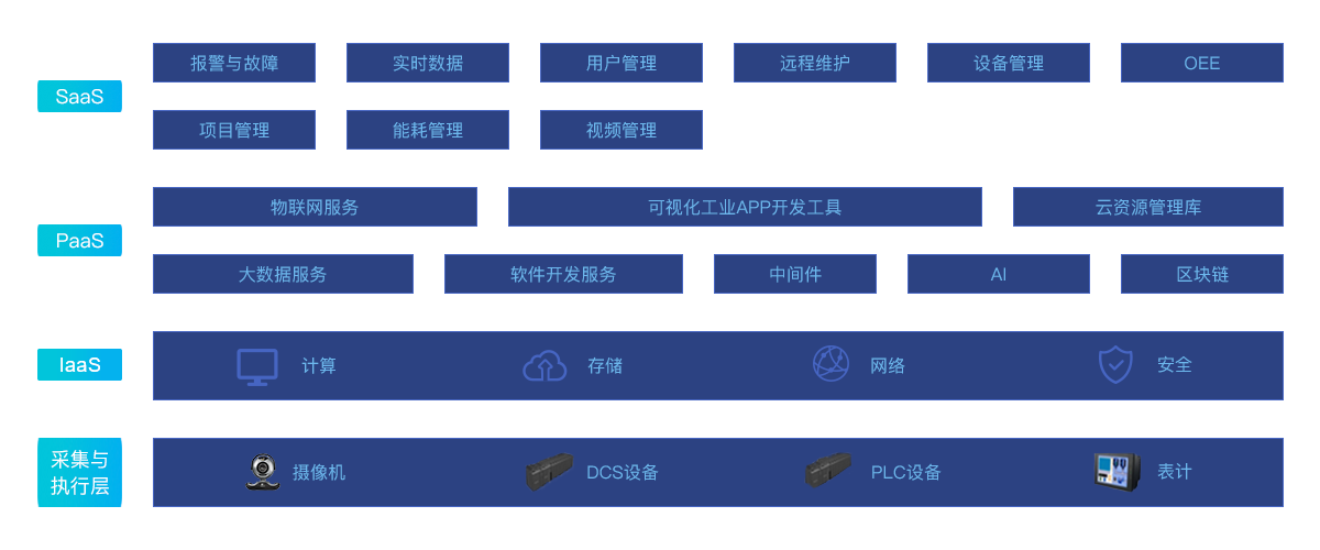 采集执行层完成现场数据的采集及设备执行,现场数据来源主要包括:顺利获得驱动采集现场PLC、仪表、摄像机等数据 IaaS层可完成计算、存储、网络、安全功能 基于Ebpay云的通用PaaS层给予物联网、大数据、开发平台、AI、区块链等功能 业务应用层包含了设备管理、实时数据、远程维护、能耗管理、视频管理等相关功能,共同构建完善的设备管理体系,完善设备管理工作。为设备运营维护单位给予了高效的集中式、透明化、全方位的精准运营新模式