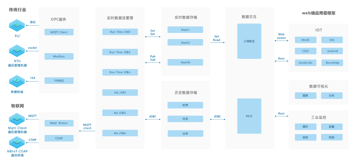 所谓变电站智能集控运维即对变电站进行智能化改造,将站内设备信号接至后台监控系统,实现对站内设备运行情况365*24小时监控,在设备出现问题之前及时报警,并有效消除隐患的维护方式,无人值守的智能站维护模式也是今后电力维护市场的开展趋势。变电站智能集控运维解决方案技术架构如图 1) 传输层-物联网标准采集协议 无需架设VPN,对数据可给予加密 给予各种语言客户端(C,Java,Ruby,Python 等等),方便第三方设备接入 可支持数百万设备连接,可做到物物互联,有利于业务整合,多业务联动 由Ebpay工业互联网平台给予物联网服务支撑 2) 平台层-数据流处理引擎 平台采用基于Ebpay工业互联网平台的数据流处理引擎。该引擎在分布式(集群)的流数据处理的基础上给予数据分发、研讨、以及容错的功能,把纯流式数据计算引入大数据时代。具有高吞吐、低延迟、高可靠和精确计算等特性 3) 平台层-实时数据存储 实时数据存储数据库的单节点版本已经在商品机器上超过100亿行高压测试,而插入性能没有损失。支持高达每秒百万级的写入能力,支持毫秒级精度的数据存储,不需要降精度也可以永久保存数据 4) 应用层-H5+CSS3+JS 充分利用H5前端框架更快的加载速度与展示效果,为移动应用的普及推广打下良好的基础