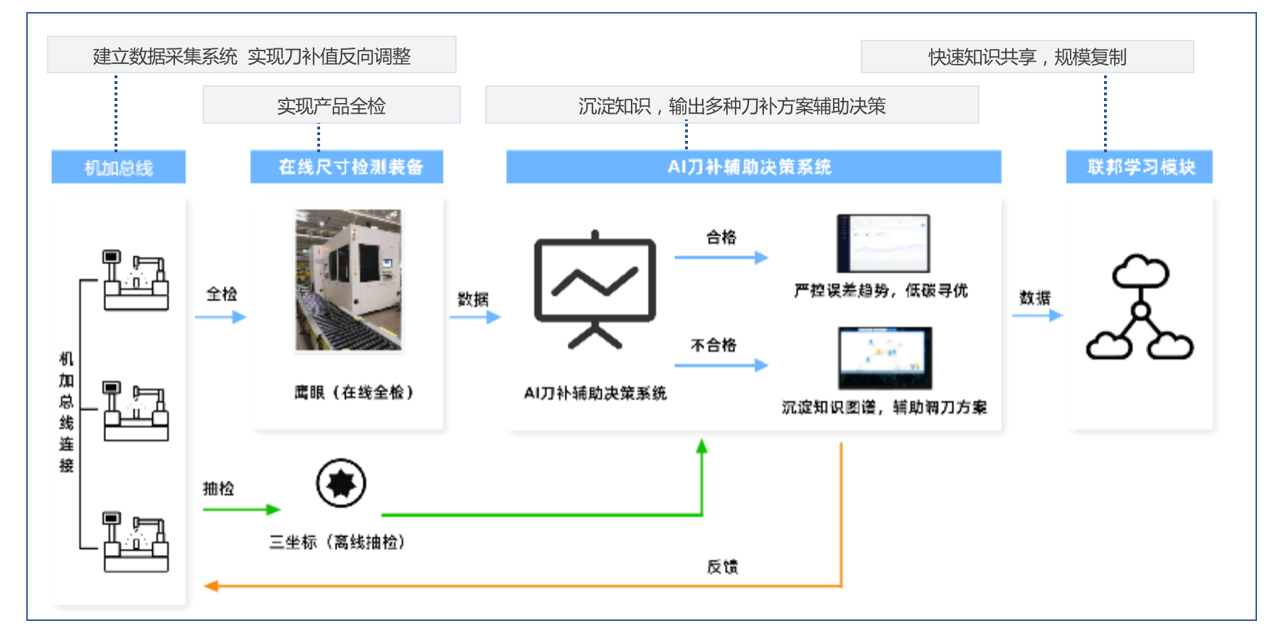 面向机械加工流程,顺利获得机加总线、在线尺寸检测装备、AI刀补辅助决策系统、联邦学习四大模块,提升产品质量及生产效率,减少原料浪费降低成本。