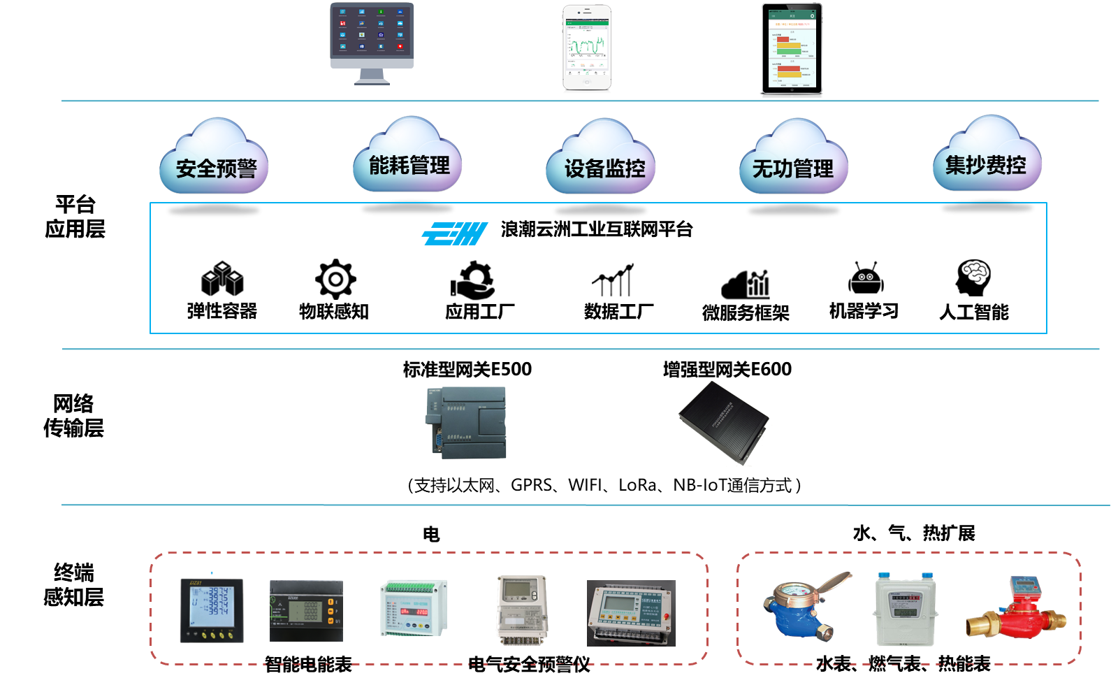 智慧能源管理业务主要包括如下类别:安全预警、能耗管理、设备监控、集抄费控,图为业务架构 终端感知层给予主要是现场的水表、燃气表、热能表,以及安装在现场的智能电表、电气安全预警仪等 网络传输层主要是指给予工业网关,负责终端智能表计与平台应用层的连接,实时采集设备数据,上报到云上的物联网服务 平台应用层基于Ebpay云洲工业互联网平台搭建,给予面向能源管理领域的特定场景应用。平台给予虚拟化、物联感知、应用工厂、数据工厂、微服务、机器学习、人工智能等服务能力,支撑智慧能源管理应用 应用层给予安全预警、能耗管理、设备监控、无功管理、集抄费控等功能,服务安全用能、经济用能以及精细化管理的需求,同时支持PC端和移动端(IOS、Android)访问,满足不同用户群体使用需求
