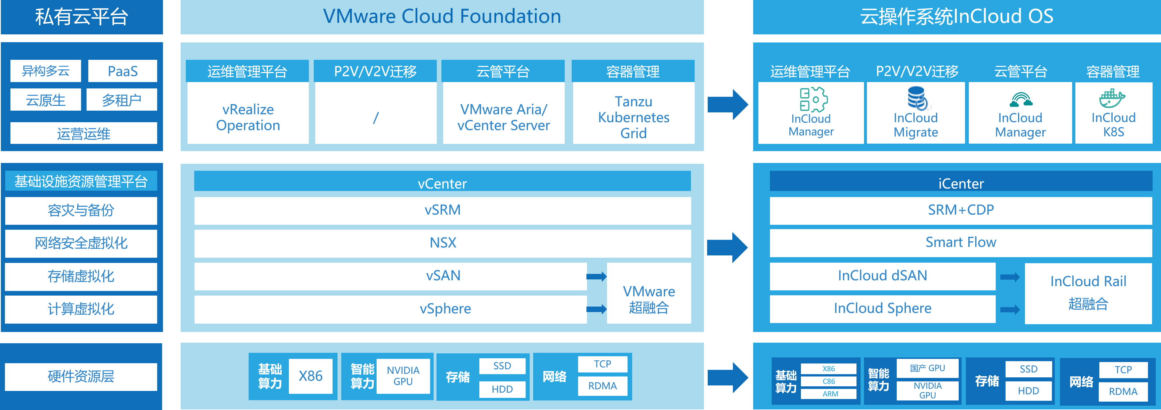 虚拟化云、裸金属统一平台管理,类VMware的操作体验,ALLINONE界面覆盖全运维流程,支持出场预装,有效提升运维效率