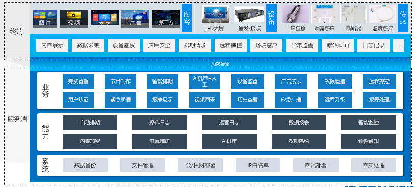 平台以“三联三管”的为目标,在符合安全的前提条件下,实现对大屏的统一管控,为客户解决大屏的播出安全和内容监测功能。
